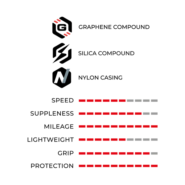 2C Formulation graphene + silica: Long mileage, puncture resistance, high grip & speed in all conditions.